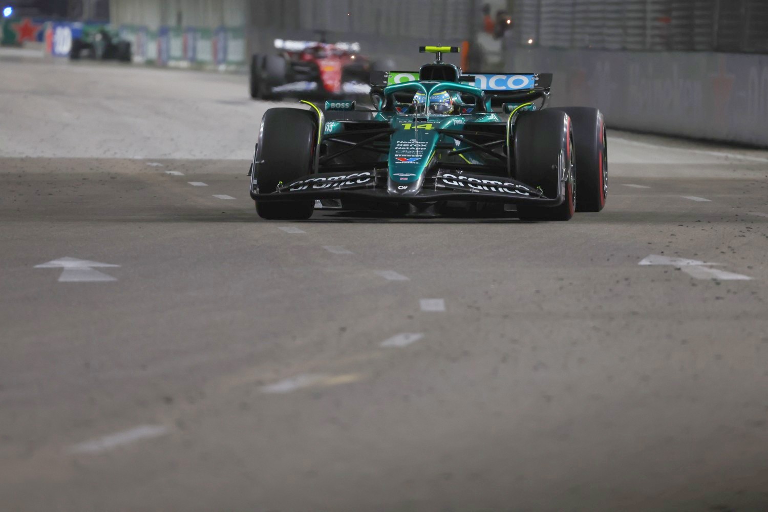 Fernando Alonso of Spain and Aston Martin F1 Team races during the 2025 F1 Grand Prix of Singapore at Marina Bay Street Circuit on October, 2025 in Singapore, Singapore. (Photo by Zak Mauger/LAT Images for Aston Martin)