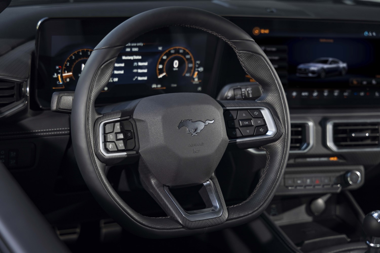 Slide into the plush leather‑trimmed seats, and you realize that the Mustang, like many recent cars, has become much more luxurious. Gone is the cheap plastic look and feel of the old car. Now the Mustang feels much more expensive. There is a 12.4‑inch digital gauge cluster ahead, a 13.2‑inch center touchscreen, wireless Apple CarPlay and Android Auto compatibility and much more that you would not expect in a Mustang.