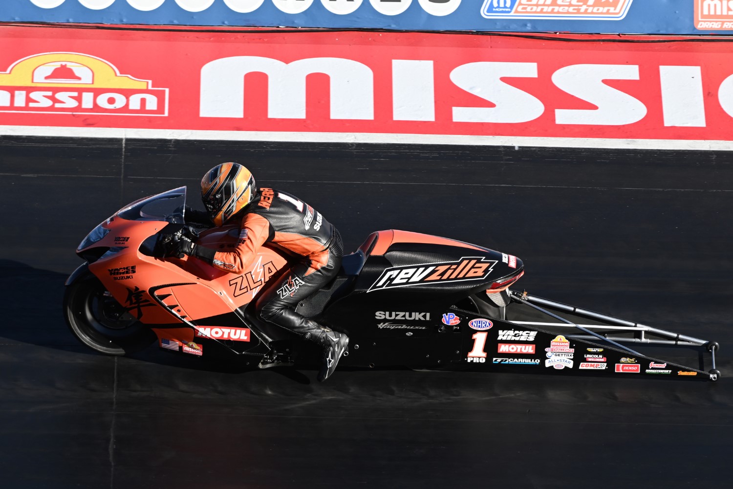 Defending two-time champ Gaige Herrera rode a wave of perfection to his third consecutive Vegas win, edging Angie Smith in the final with a 6.809-second blast at 198.17 mph aboard his RevZilla/Motul/Vance & Hines Suzuki. The triumph—his seventh this season and 28th career—trimmed teammate Richard Gadson’s points lead to a razor-thin 21, less than one round’s worth with the finale looming.