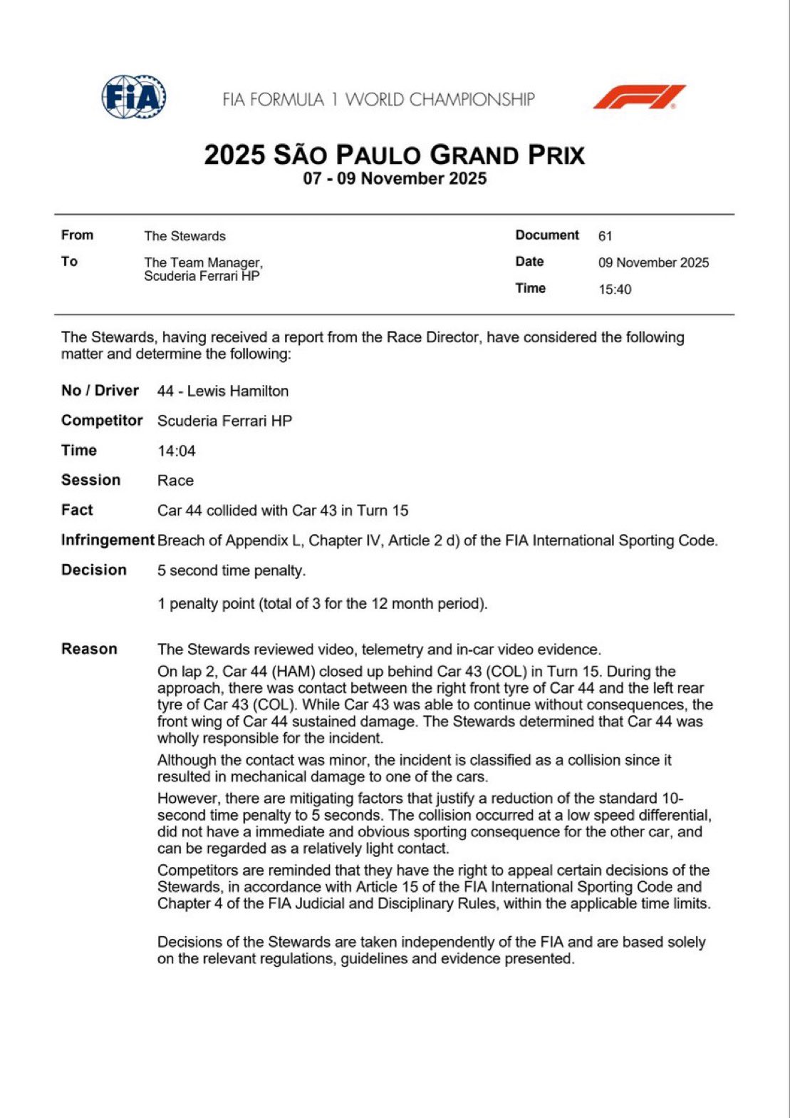 The seven-time world champion endured a torrid few days at Interlagos – penalized again, struggling with balance, and ultimately parking his damaged SF-25 while running near the back. Ferrari teammate Charles Leclerc also failed to finish, leaving the team empty-handed and slipping to fourth in the constructors’ standings.