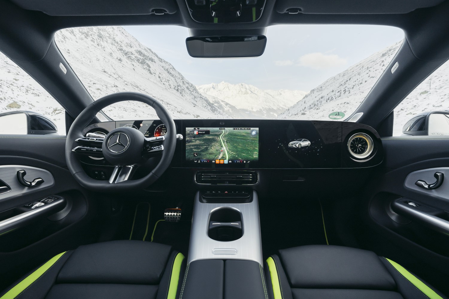 The CLA hybrid features a large, one-piece fixed panoramic glass roof that contributes to the generous sense of space. The optional floating MBUX Superscreen spans the width of the interior with a 10.25-inch driver display, 14-inch central display and 14-inch front passenger display behind a large glass surface. The in-car entertainment offering for the front passenger includes over an expansive portfolio of apps including the video streaming platform Disney+3,4. All displays are powered by state-of-the-art, high-performance chips and real-time graphics from the Unity Game Engine.