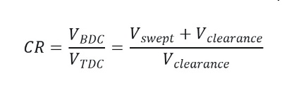 The geometric compression ratio (CR) is defined as the ratio of the cylinder volume at bottom dead center (BDC) to the volume at top dead center (TDC) of the piston stroke: