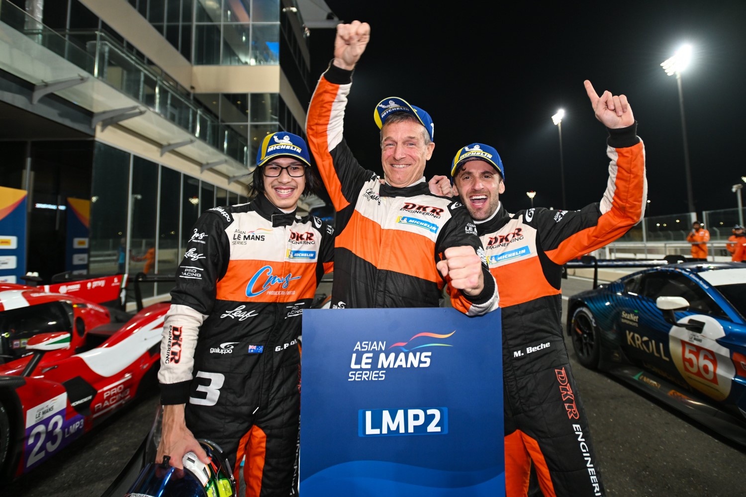 No. 3 DKR Engineering Oreca drivers celebrate victory in the 2nd 4 Hours of Abu Dhabi Asian Le Mans race. Image Supplied.