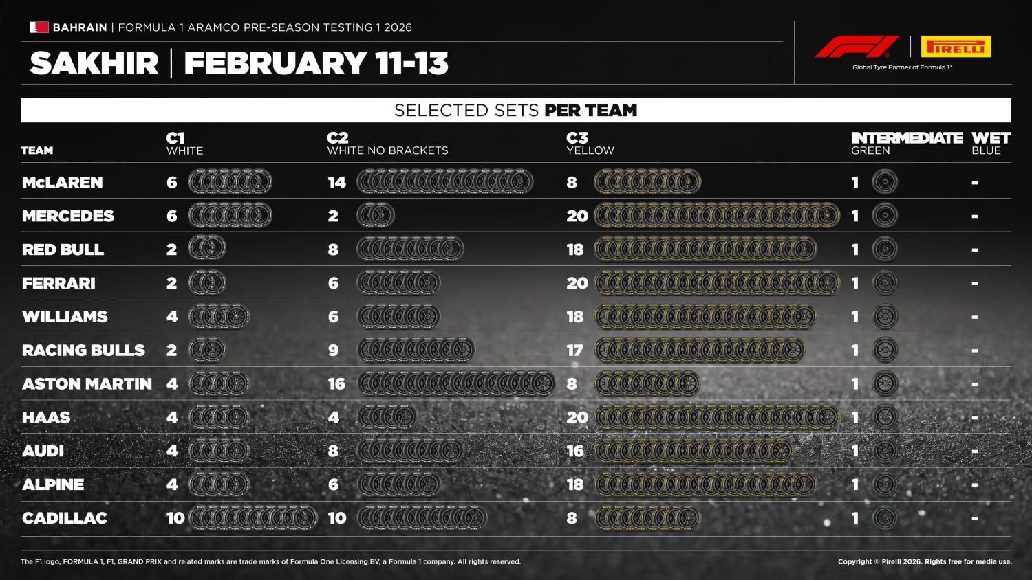 For the three days of the first pre-season test, teams can only run the C1, C2 and C3 slick compounds. They can use up to 28 sets of dry weather tires, while one set of Cinturato Intermediates will also be available to them.