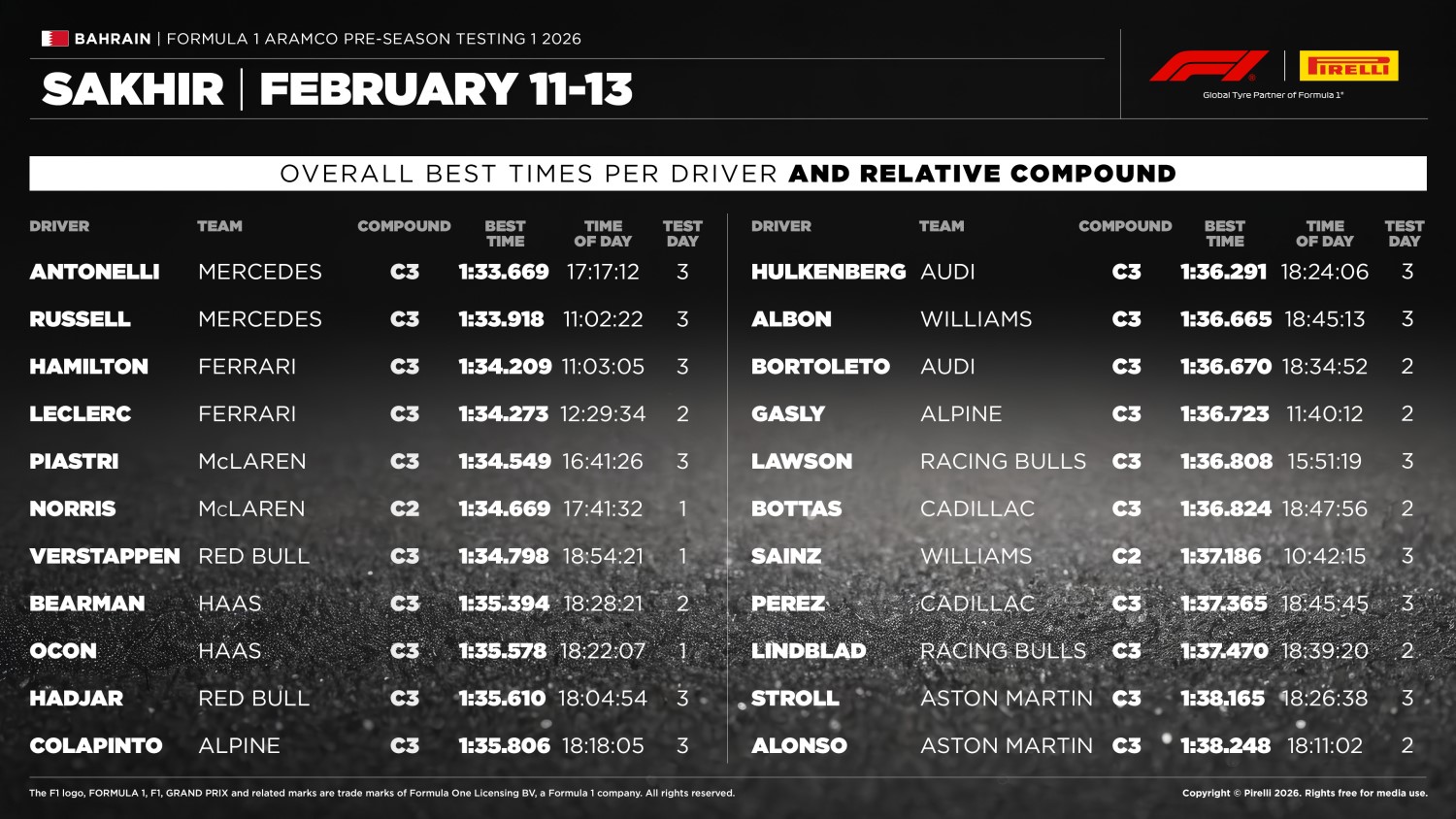 The first pre-season test in Bahrain concluded with a Mercedes one-two at the top of the timesheets. Kimi Antonelli set the fastest lap of 1:33.669s, beating teammate George Russell by 0.249s. Behind them, Ferrari’s Lewis Hamilton clocked a 1:34.209s. All three drivers, running on the C3 compound, were not only the quickest today but also recorded the fastest times overall across the three days in Sakhir.