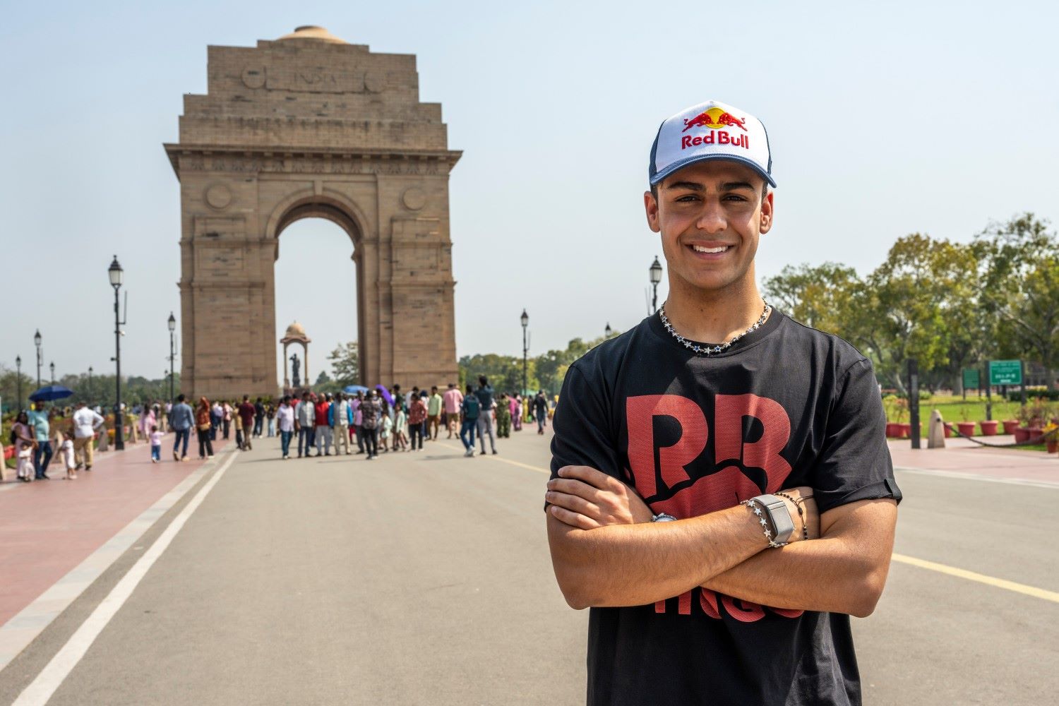 Arvid Lindblad seen in front of the India Gate prior the Red Bull Moto Jam in New Delhi, India on February 28, 2026. // Focus Sports / Red Bull Content Pool //