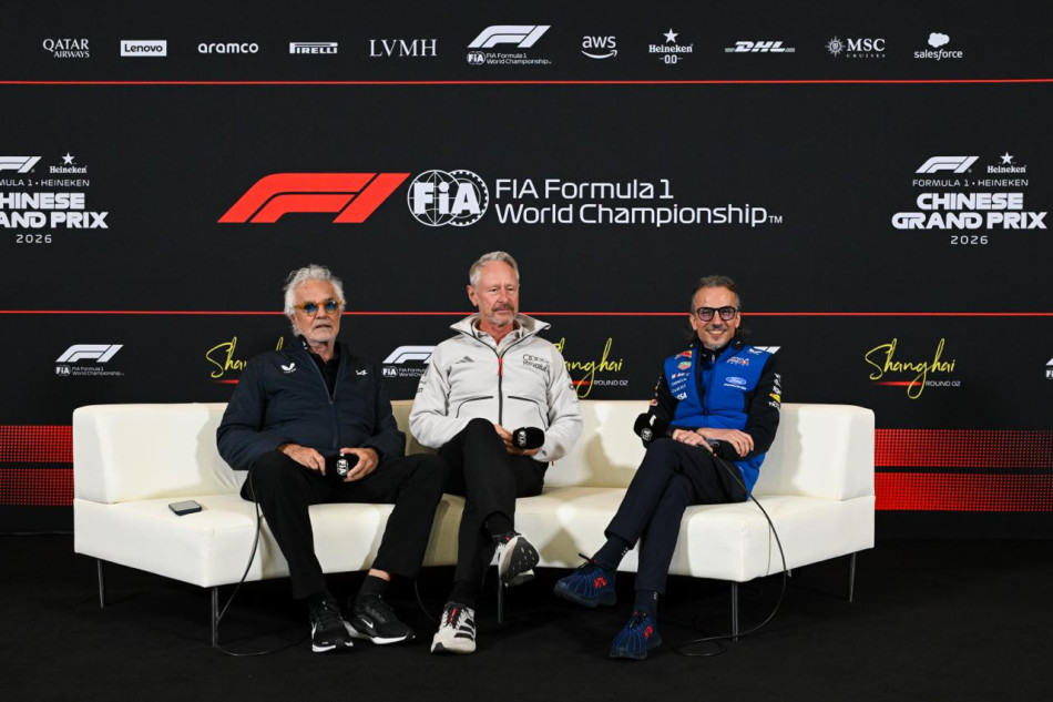 Flavio Briatore, Executive Advisor of Alpine F1 Jonathan Wheatley, Team Principal of Audi F1 Team and Laurent Mekies, Team Principal of Oracle Red Bull Racing in the Team Principals Press Conference during practice ahead of the F1 Grand Prix of China at Shanghai International Circuit on March 13, 2026 in Shanghai, China. (Photo by Alex Bierens de Haan/Getty Images) // Getty Images / Red Bull Content Pool //