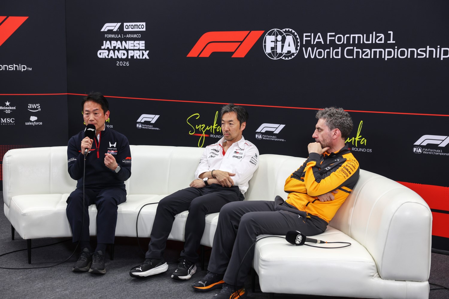 Koji Watanabe, President, CEO and Representative Director of Honda Racing Corporation Ayao Komatsu, Team Principal of Haas F1 and Andrea Stella, Team Principal of McLaren in the Team Principals Press Conference during practice ahead of the F1 Grand Prix of Japan at Suzuka Circuit on March 27, 2026 in Suzuka, Japan. (Photo by Alastair Staley/LAT Images)