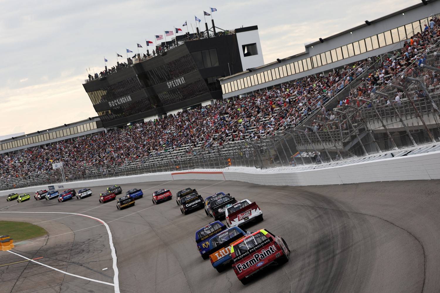 Layne Riggs drove a strong race to finish third for Front Row Motorsports. Stewart Friesen was fourth, followed by Grant Enfinger, defending Rockingham winner Tyler Ankrum, Corey LaJoie, Ty Majeski, pole-sitter Jake Garcia, and Cole Butcher.