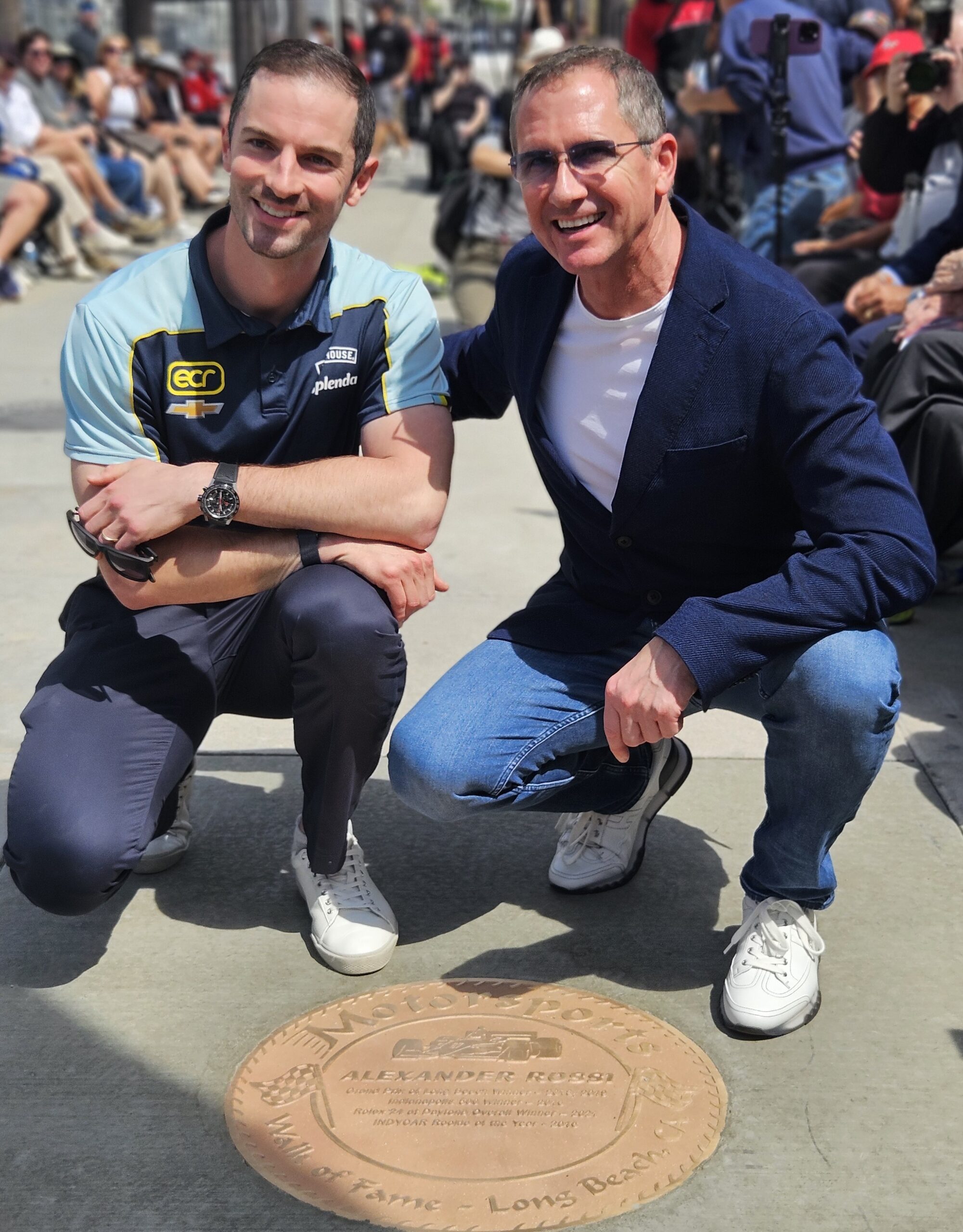 Alexander Rossi received his medallion on Pine Avenue for the Long Beach Motorsports Walk of Fame today, along with former Long Beach mayor Bob Foster.