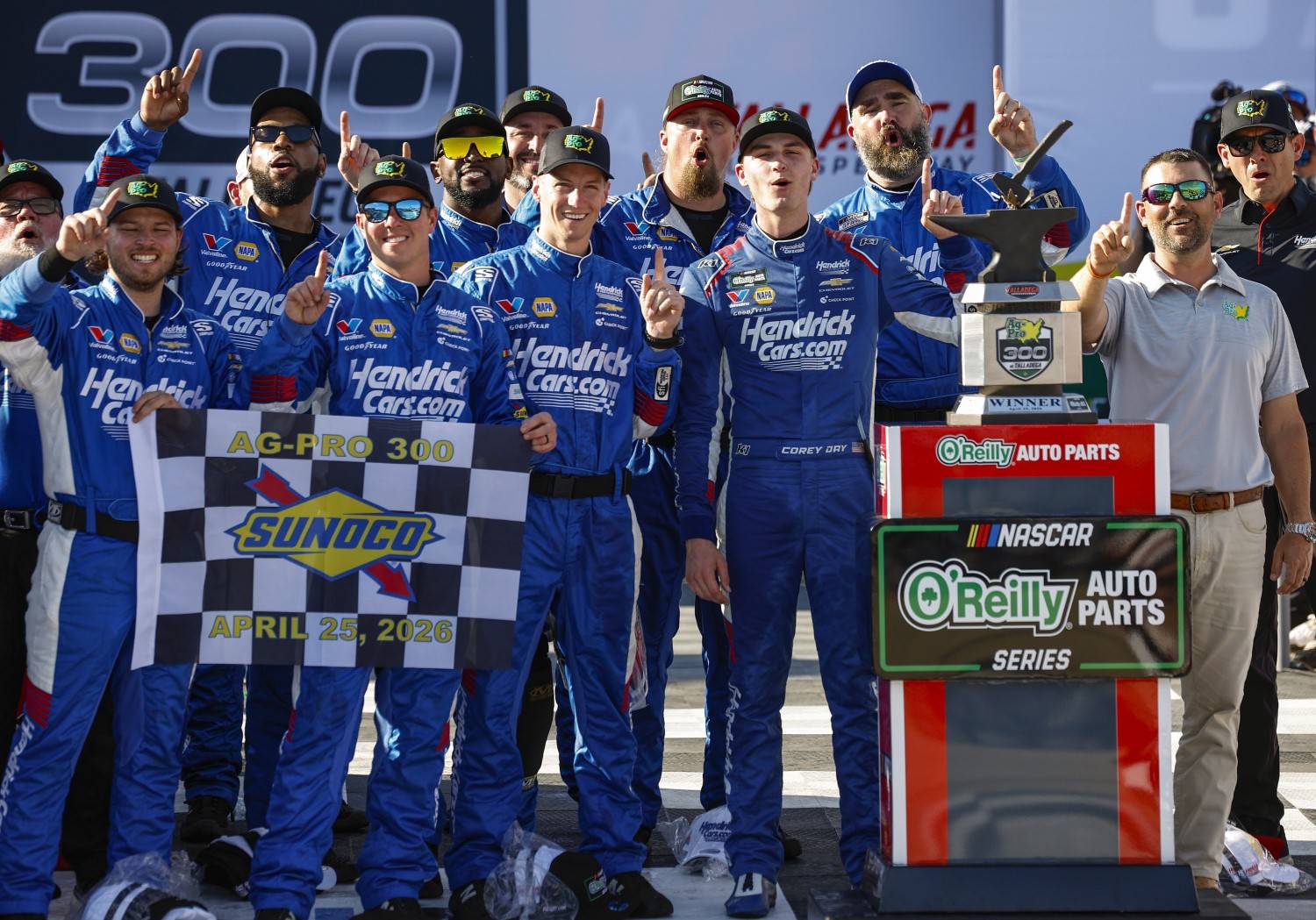 Day crossed the line under yellow and checkered flags, earning Hendrick Motorsports its first series win at Talladega and handing the organization its 100th victory across NASCAR’s national touring series. The moment was made even sweeter by the presence of former NFL star Jason Kelce, who suited up in Hendrick blue and worked tires on pit road as a guest crew member for the day.